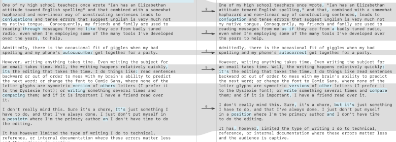 What came back was, to me, amazing. They were my words—just done right! None of the randomness of a spell checker, or the (un)helpful suggestions from a grammar checker, or the attempts to 'punch it up' from a writing assistant, just the red marks I'd normally get from a helpful colleague. All I needed to do was compare the before and after and decide what to keep.